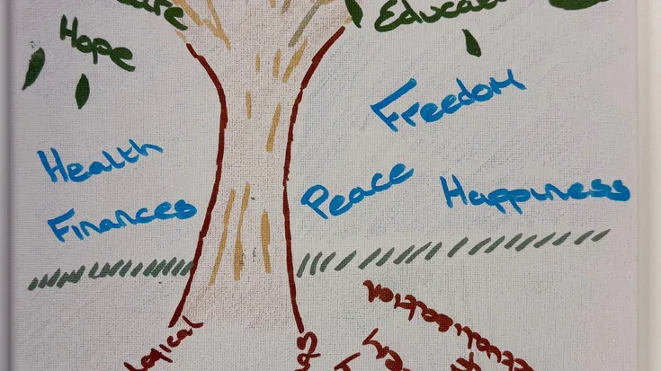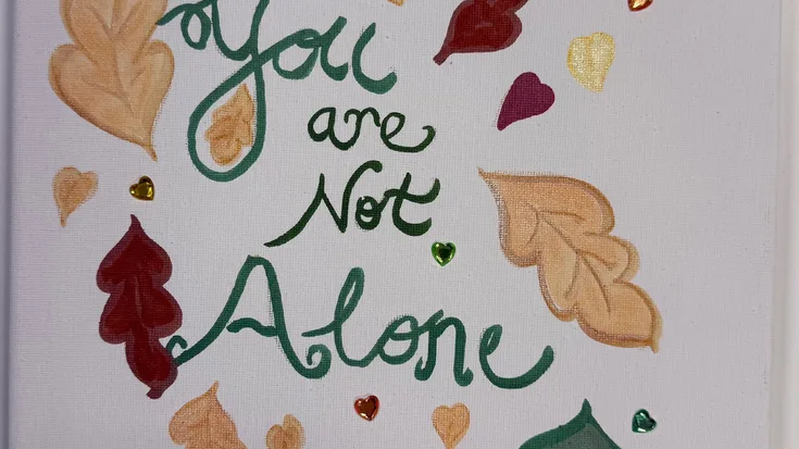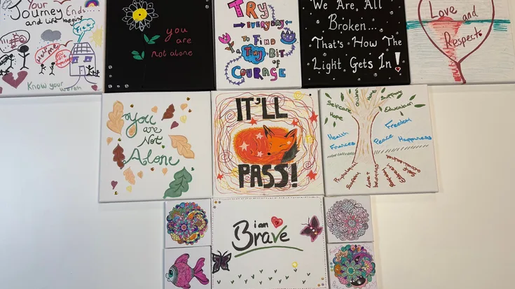 The workshop was built around simple but powerful creative activities. Each person was invited to decorate stones with colours, symbols or words that represented resilience. Canvas squares were used as small personal art pieces, later forming part of a larger collective display. Participants also created messages of solidarity, offering encouragement for others who may be taking their first steps towards safety and support.